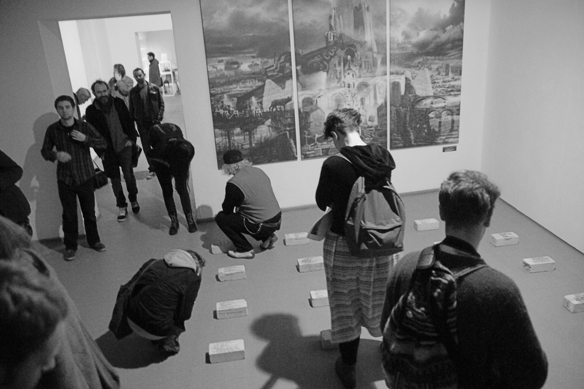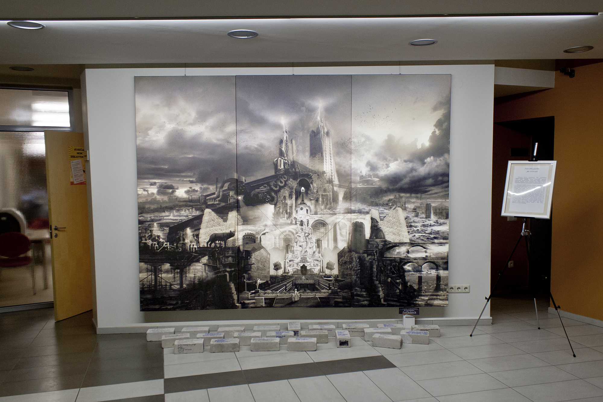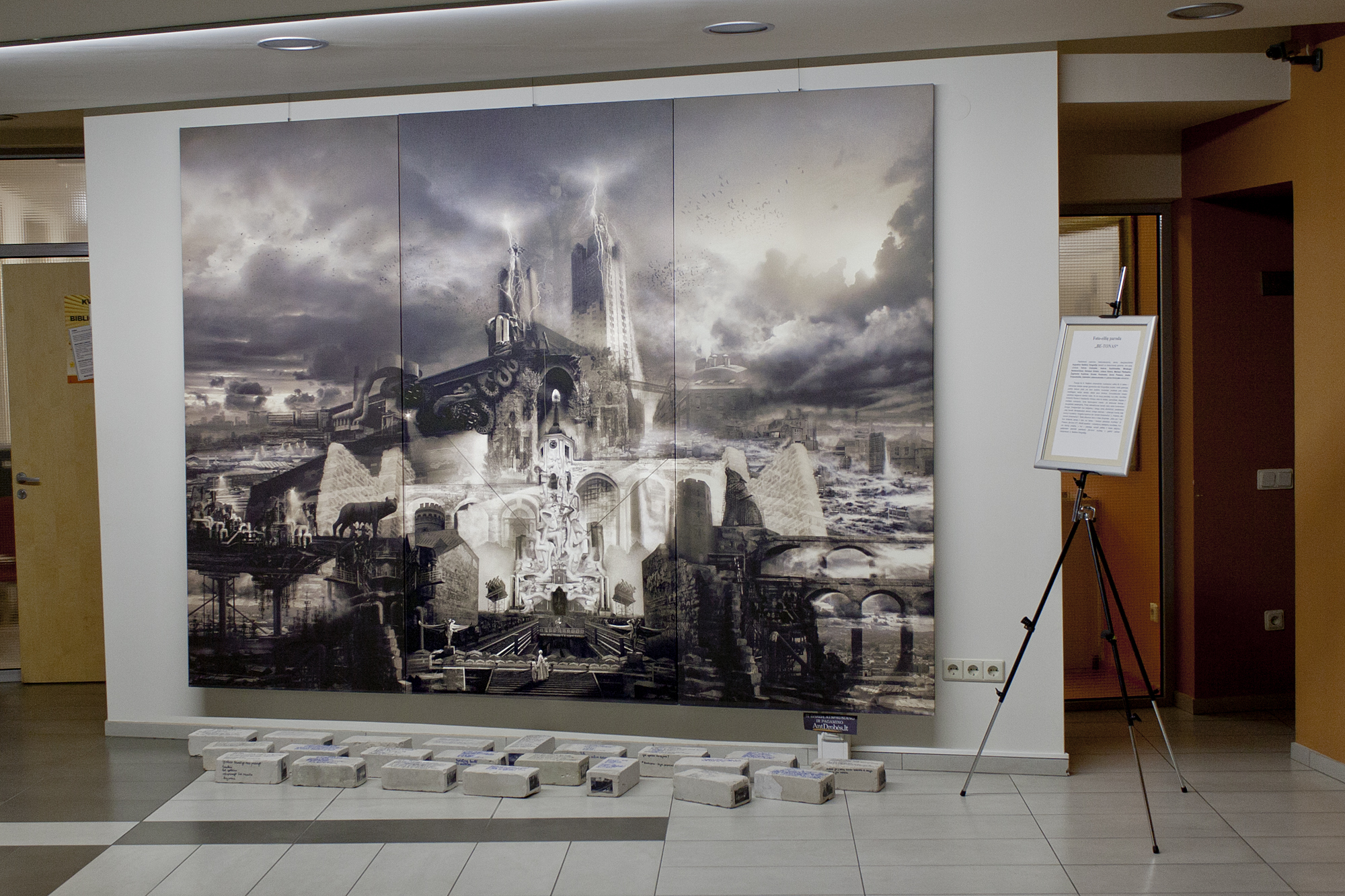In 2012 I worked on an installation called “Be-tono” (“toneless”) for the audio-visual poetry festival Tarp 2012 in Vilnius, Lithuania. I contributed a large scale photomontage called Altar Shadows, which was inspired by life and work of an early 20th century Lithuanian writer and poet Vincas Mykolaitis-Putinas. The festival then invited a number of contemporary poets to write their poetic interpretations of the image, which were then put onto grey silicate bricks and arranged on the floor. Installation was shown at the Vartai gallery, Vilnius and then travelled to Klaipėda, Lithuania, where it appeared at the I.Simonaitytė’s library.